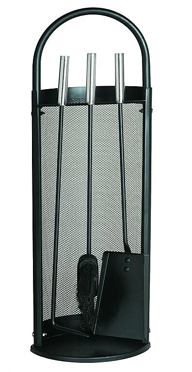 Zestaw narzędzi kominkowych zawiera grabie, miotłę i łopatę w czarnym kolorze oraz uchwyty ze stali nierdzewnej.