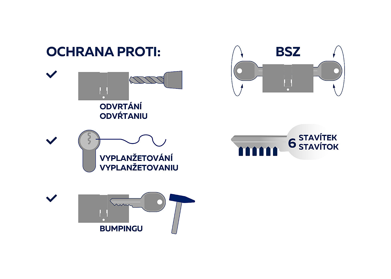 - Zabezpieczenie przed przewierceniem z 6 hartowanymi elementami stalowymi. Składa się z 5 trzpieni i 1 bębenka.