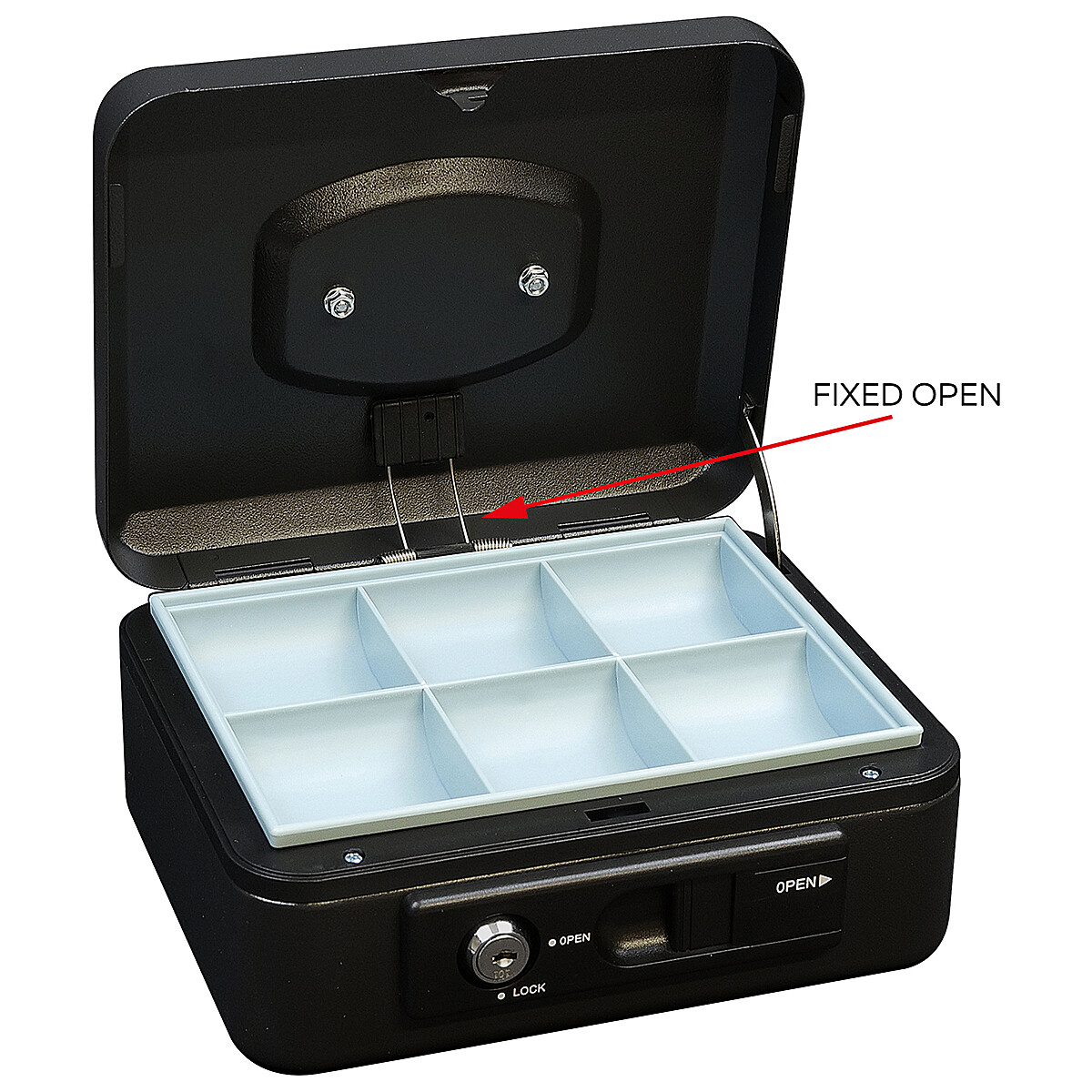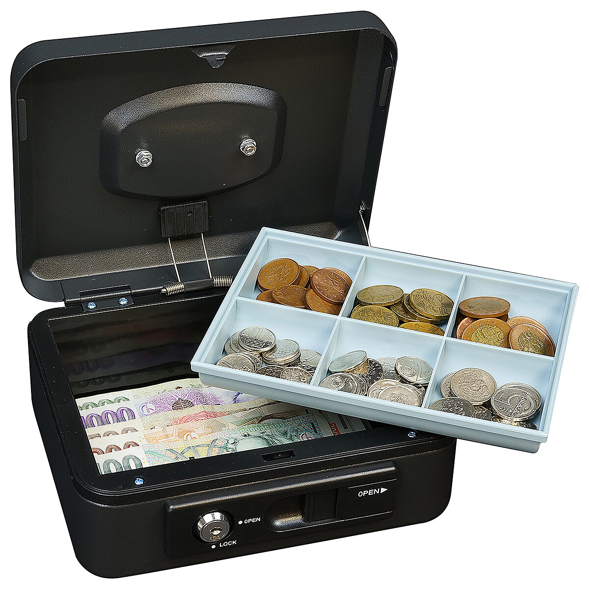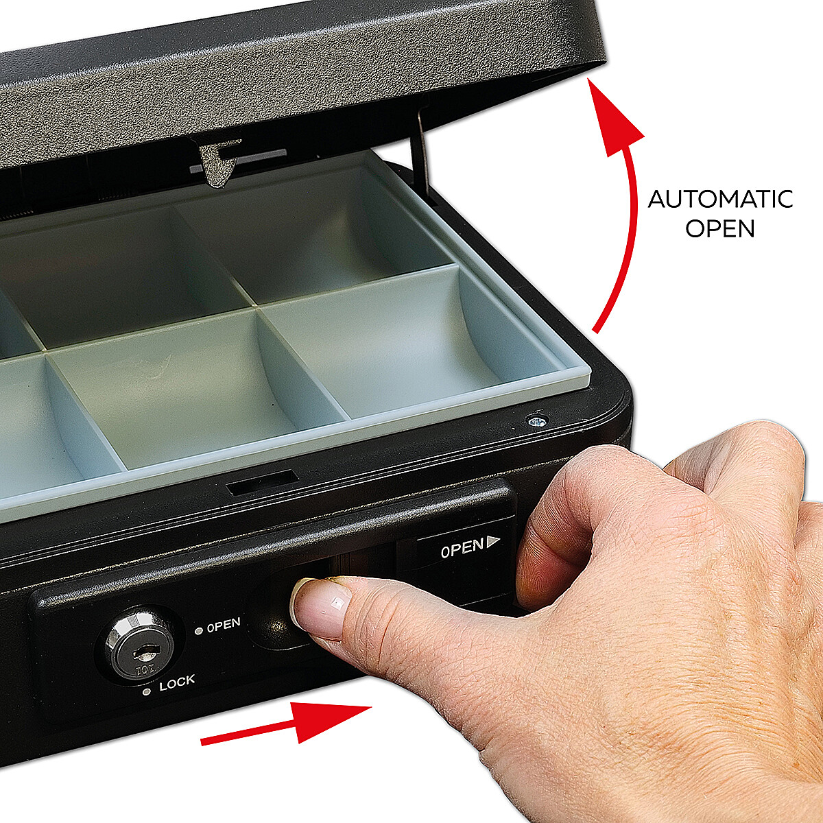 Stalowa skarbonka wyposażona jest w zewnętrzną dźwignię, która umożliwia wygodne, automatyczne otwieranie pokrywy. Po zamknięciu pokrywa automatycznie się blokuje, umożliwiając bezpieczny transport bez konieczności użycia zamka na klucz.