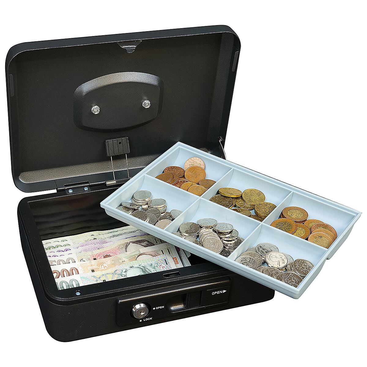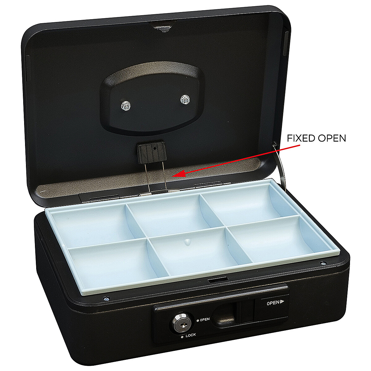 Stalowa skarbonka wyposażona jest w zewnętrzną dźwignię, która umożliwia wygodne, automatyczne otwieranie pokrywy. Po zamknięciu pokrywa automatycznie się blokuje, umożliwiając bezpieczny transport bez konieczności użycia zamka na klucz.
