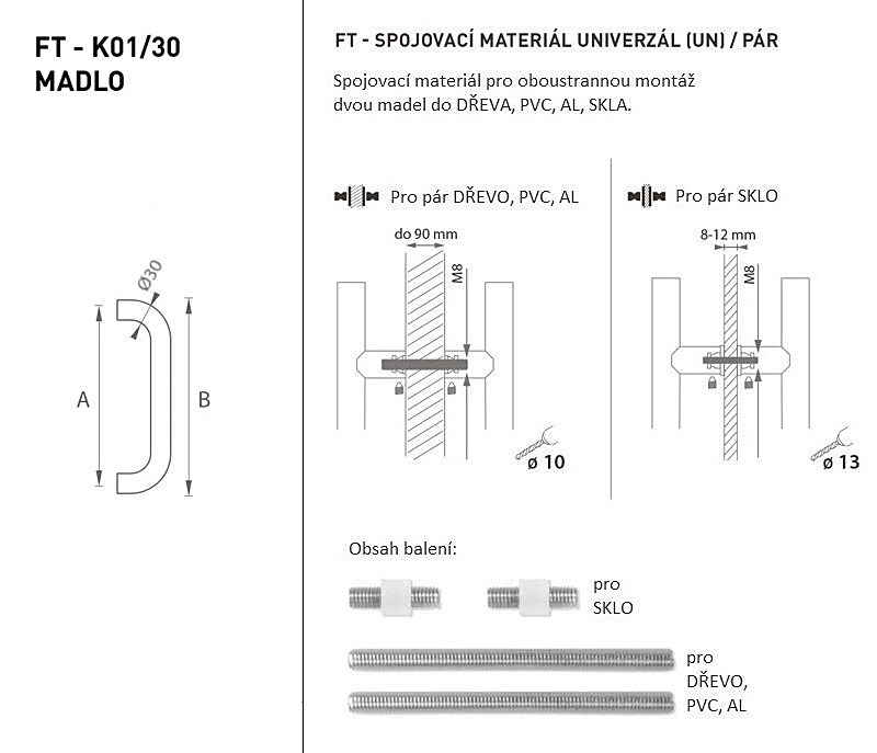 Zestaw UNIVERSAL (UN) zawiera elementy mocujące umożliwiające dwustronny montaż dwóch klamek do drewna, PCV, AL, szkła.