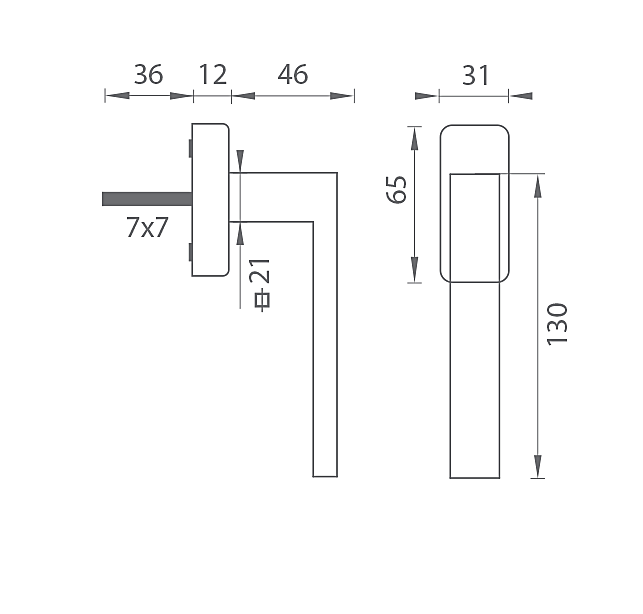 Klamka okienna euro z kwadratową rozetą wykonana jest z wysokiej jakości materiału – znalu i ma obróbkę powierzchniową. Rozeta ma wymiary 31 mm x 65 mm i grubość 11 mm.