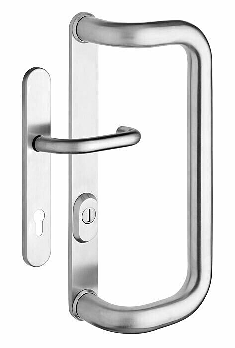 Okucia ze stali nierdzewnej z wewnętrzną osłoną i klamką pasują zarówno do drzwi wejściowych z profilem prawym, jak i lewym.