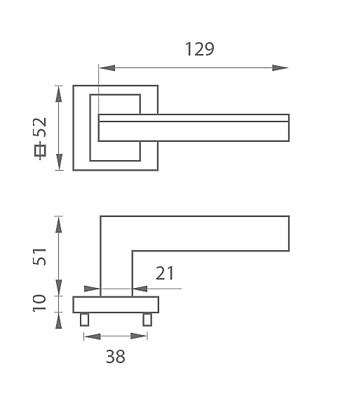 Klamka rozetowa do drzwi wewnętrznych z rozetą kwadratową wykonana jest z odlewu z wysokiej jakości stopów cynku i aluminium i poddana obróbce powierzchniowej. Rozeta ma wymiary 52 mm x 52 mm i grubość 10 mm. Rękojeść jest obrobiona powierzchniowo poprzez cynkowanie i charakteryzuje się wysoką odpornością na korozję. Złączki testowane są na 100 000 cykli.