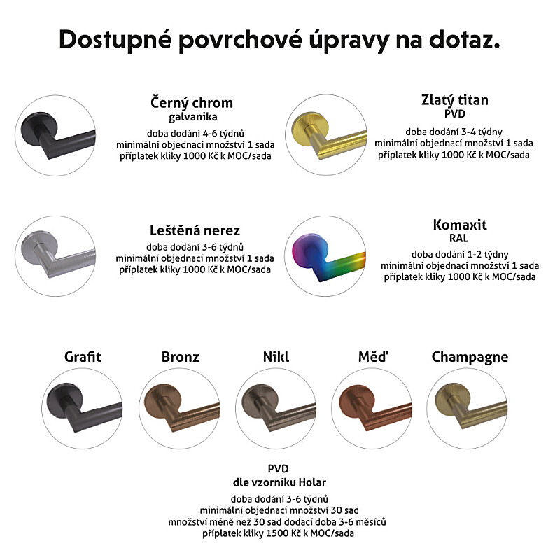 Okucie drzwiowe dostępne jest w wersji na klucz zwykły (BB), na wkładkę bębenkową (PZ) lub z blokadą WC ze wskaźnikiem zamknięcia do łazienki lub toalety.