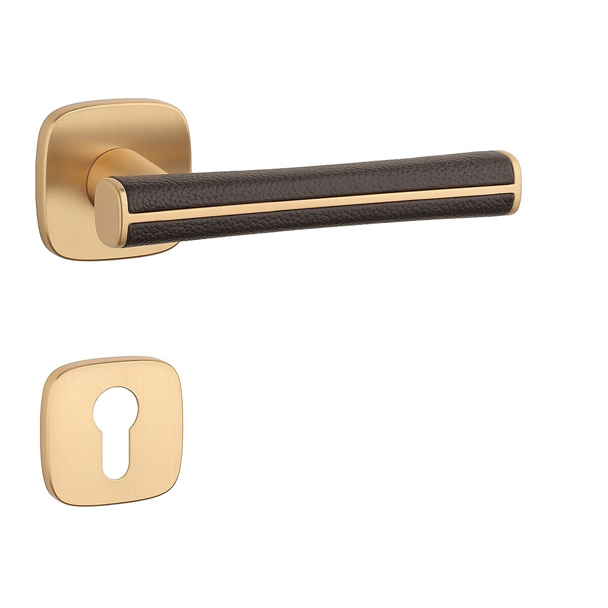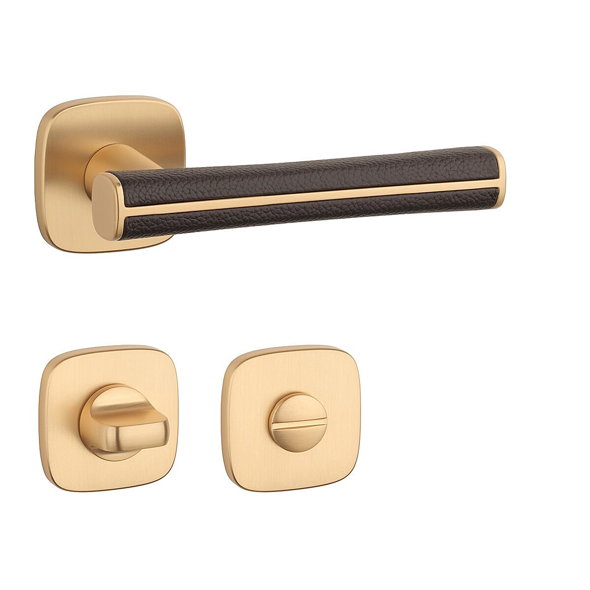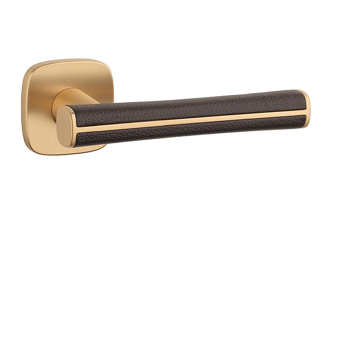 Klamka rozetowa do drzwi wewnętrznych z kwadratową, zaokrągloną rozetą wykonana jest z wysokiej jakości materiału – znalu i posiada wykończenie powierzchni. Specjalny efekt tworzy brązowa skóra otaczająca uchwyt klamki.