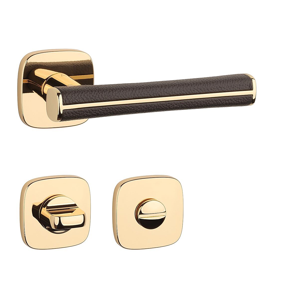 Klamka rozetowa do drzwi wewnętrznych z kwadratową, zaokrągloną rozetą wykonana jest z wysokiej jakości materiału – znalu i posiada wykończenie powierzchni. Specjalny efekt tworzy brązowa skóra otaczająca uchwyt klamki.
