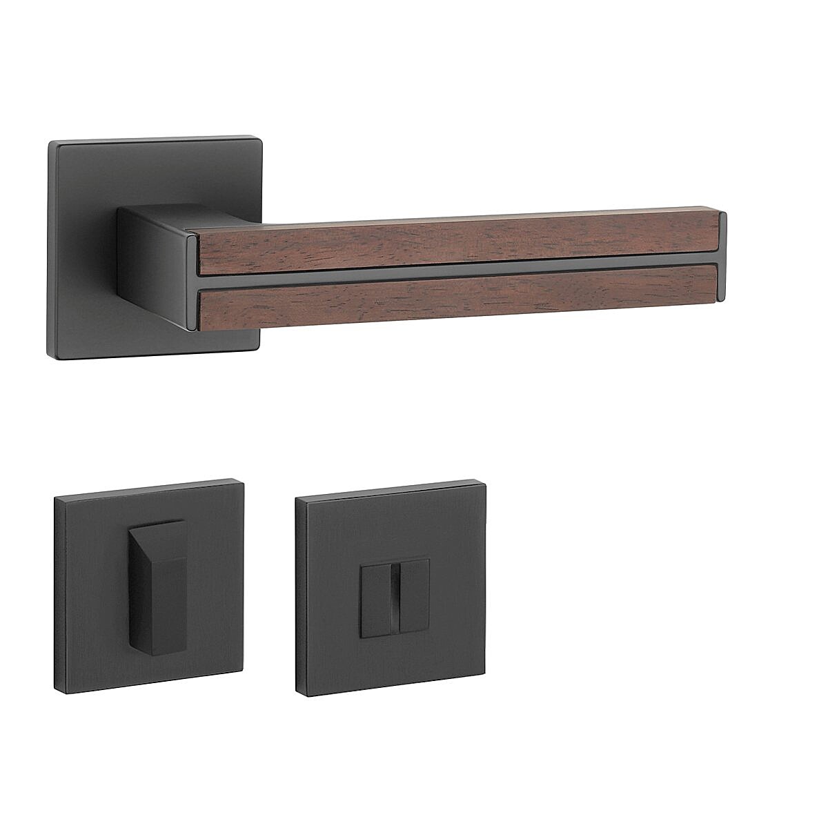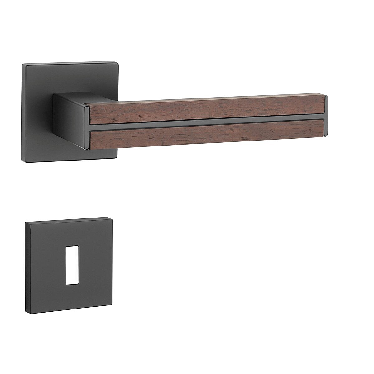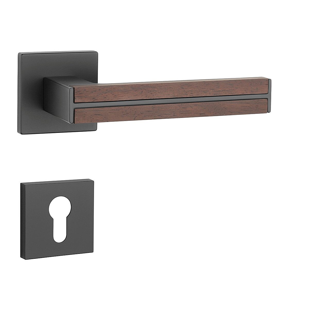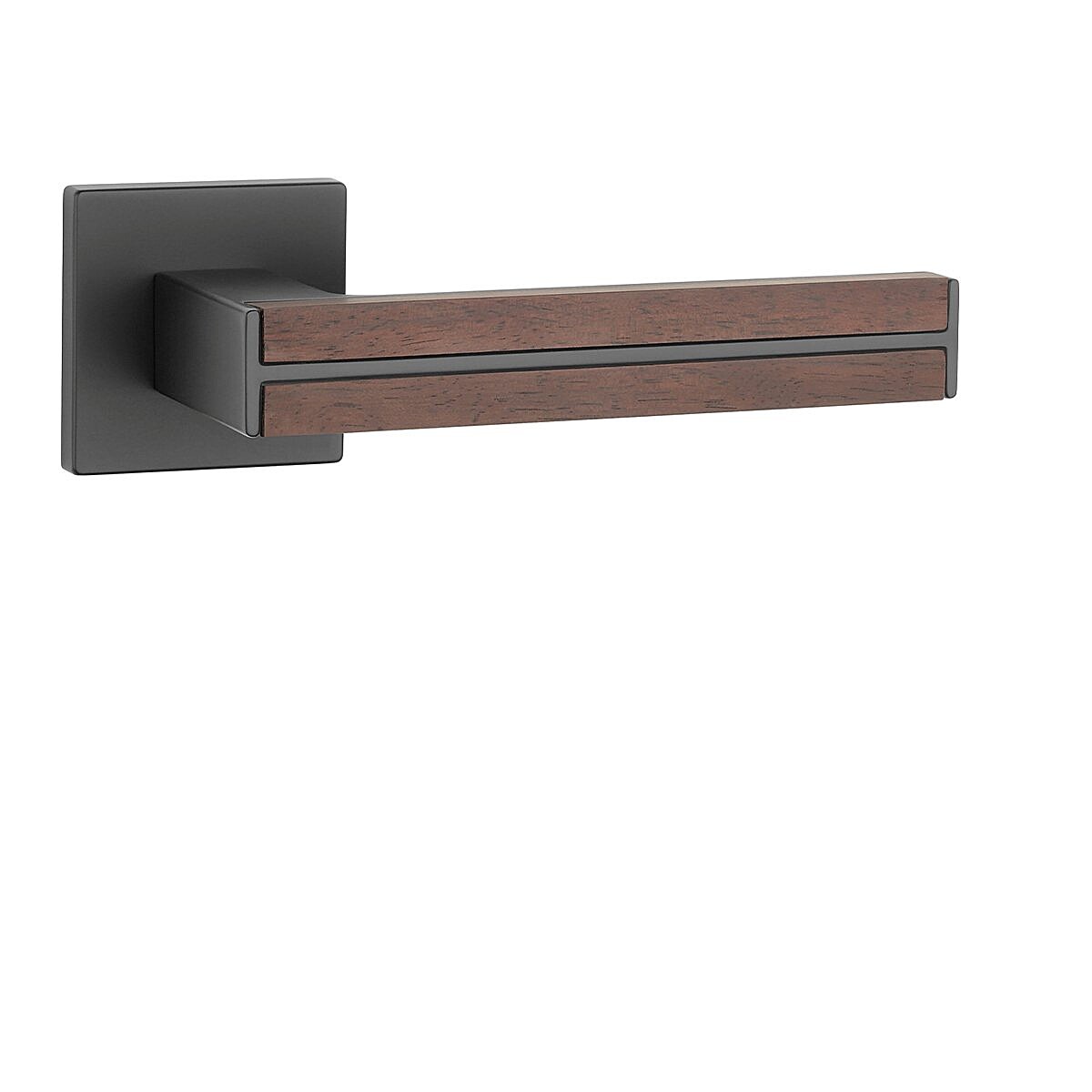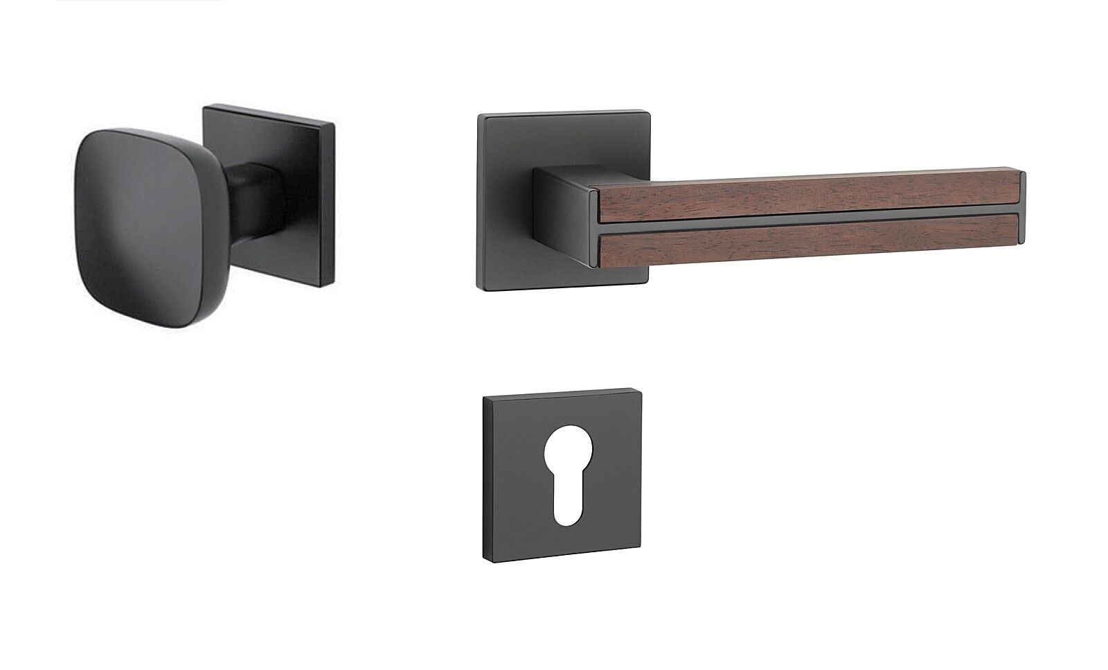 Klamka z rozetą do drzwi wewnętrznych z kwadratową, zaokrągloną rozetą wykonana jest z wysokiej jakości materiału – znalu i posiada obróbkę powierzchniową. Klamka prezentuje się stylowo i nowocześnie, co dodatkowo podkreśla połączenie czerni z drewnem sandałowym. Ten element dekoracyjny nadaje jej wyjątkowego charakteru, przywołując przyjemne uczucie ciepła i natury.