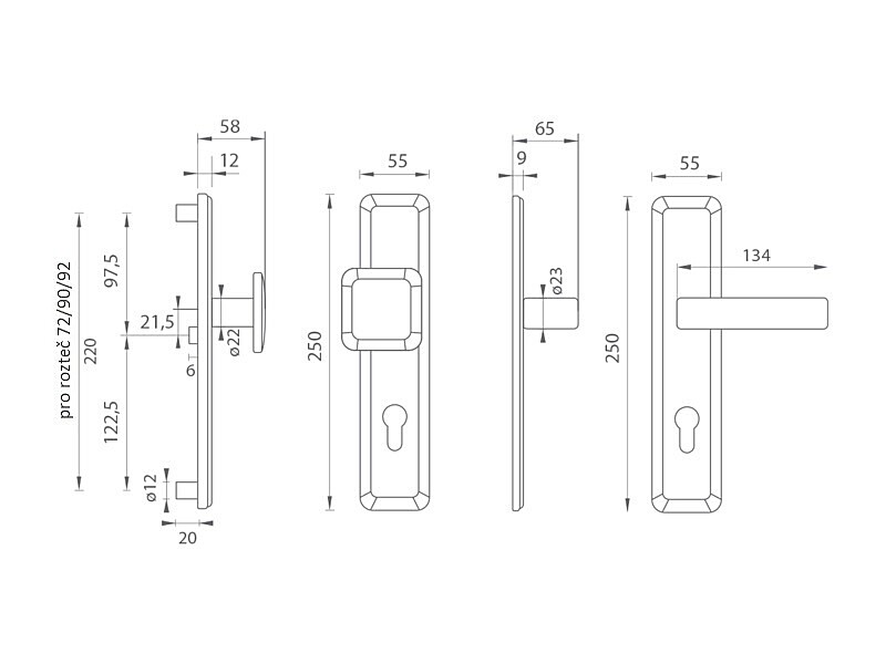 Klamka tarczowa do drzwi wejściowych i antywłamaniowych ze wzmocnioną tarczą kwadratową bez zachodzenia na wkładkę patentową wykonana jest z wysokiej jakości materiałów - mosiądzu i poddana obróbce powierzchniowej. Prostokątna tarcza ma wymiary 55 mm x 250 mm i grubość 12 mm.