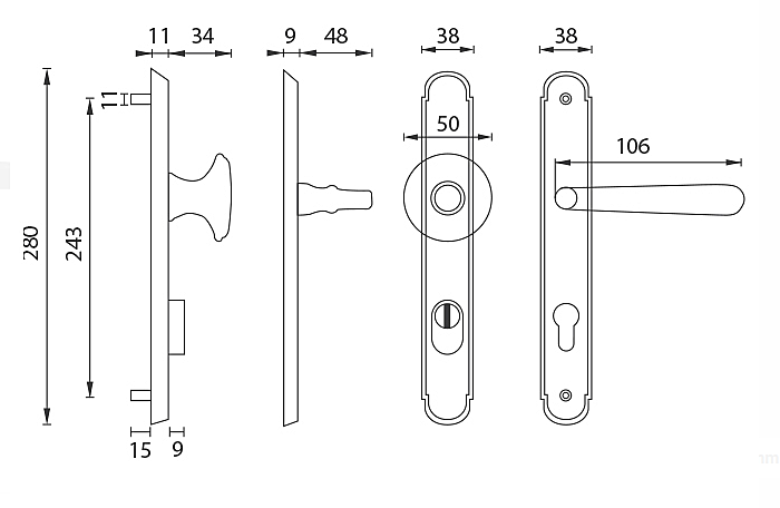 W przypadku okuć wzmocnionych należy znać odległość między osią klamki a osią klucza (rozstaw). Standardowy rozstaw wynosi 72, 90 lub 92 mm. Okucia o rozstawie 72 i 90 mm są standardem dla drzwi o grubości od 38 mm do 50 mm. Okucia o rozstawie 92 mm są standardem dla drzwi o grubości od 68 mm do 78 mm.