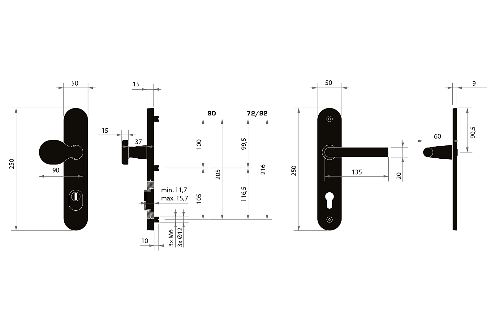W przypadku okuć zabezpieczających należy znać odległość między osią klamki a osią klucza (skok). Standardowa odległość wynosi 72, 90 lub 92 mm. Okucia są standardowo dostępne dla drzwi o grubości od 38 do 45 mm.