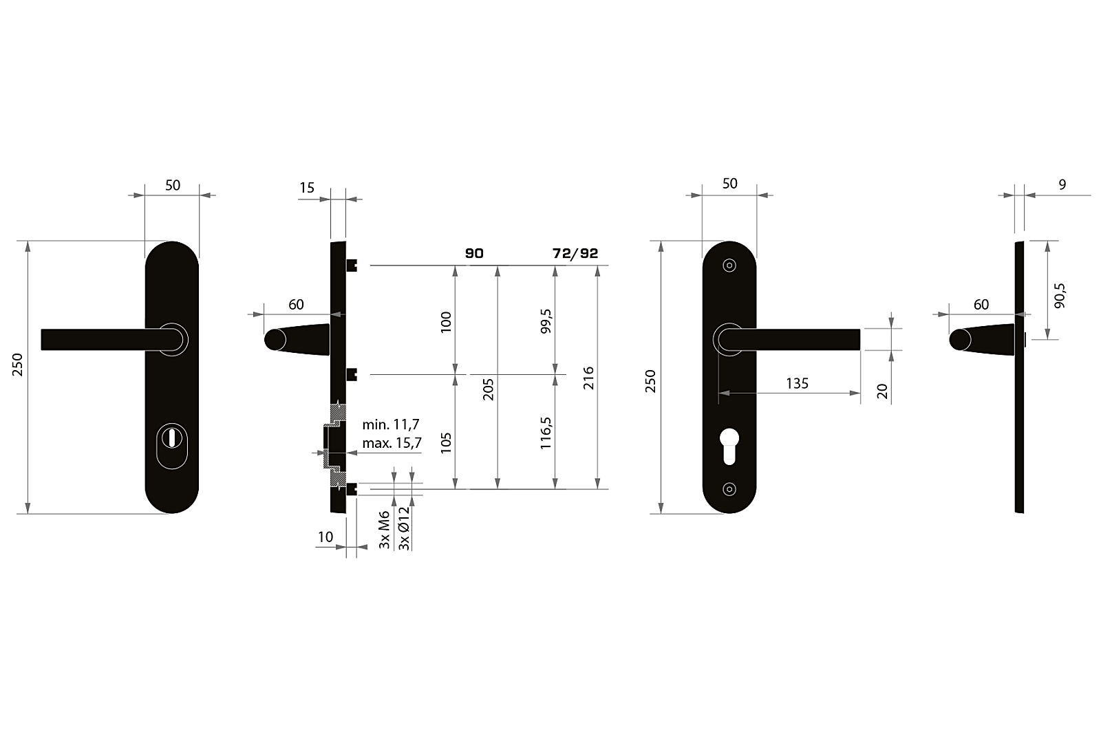W przypadku okuć zabezpieczających należy znać odległość między osią klamki a osią klucza (skok). Standardowa odległość wynosi 72, 90 lub 92 mm. Okucia są standardowo dostępne dla drzwi o grubości od 38 do 45 mm.