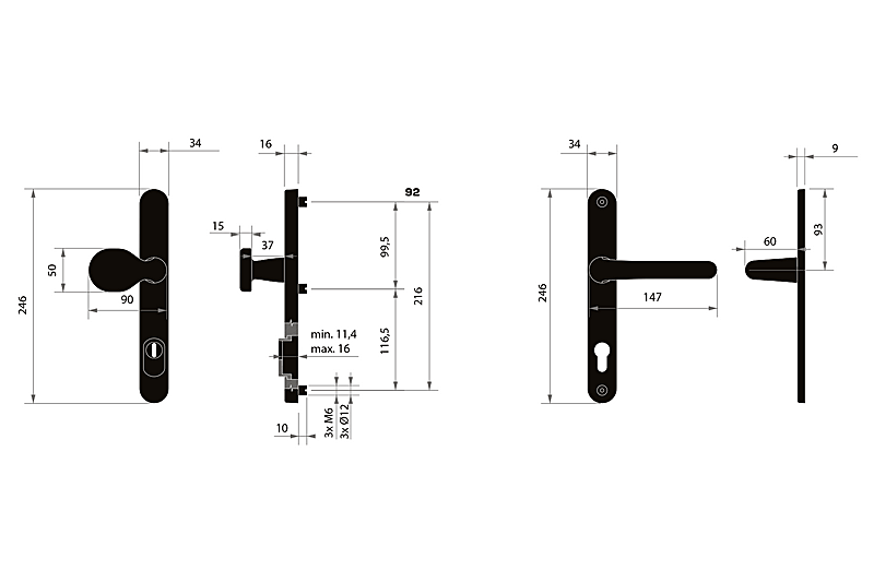 W przypadku okuć zabezpieczających należy znać odległość między osią klamki a osią klucza (skok). Standardowa odległość wynosi 72, 90 lub 92 mm. Okucia są standardowo dostępne dla drzwi o grubości od 65 do 75 mm.