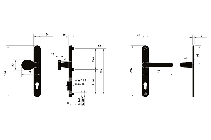 W przypadku okuć zabezpieczających należy znać odległość między osią klamki a osią klucza (skok). Standardowa odległość wynosi 72, 90 lub 92 mm. Okucia są standardowo dostępne dla drzwi o grubości od 65 do 75 mm.