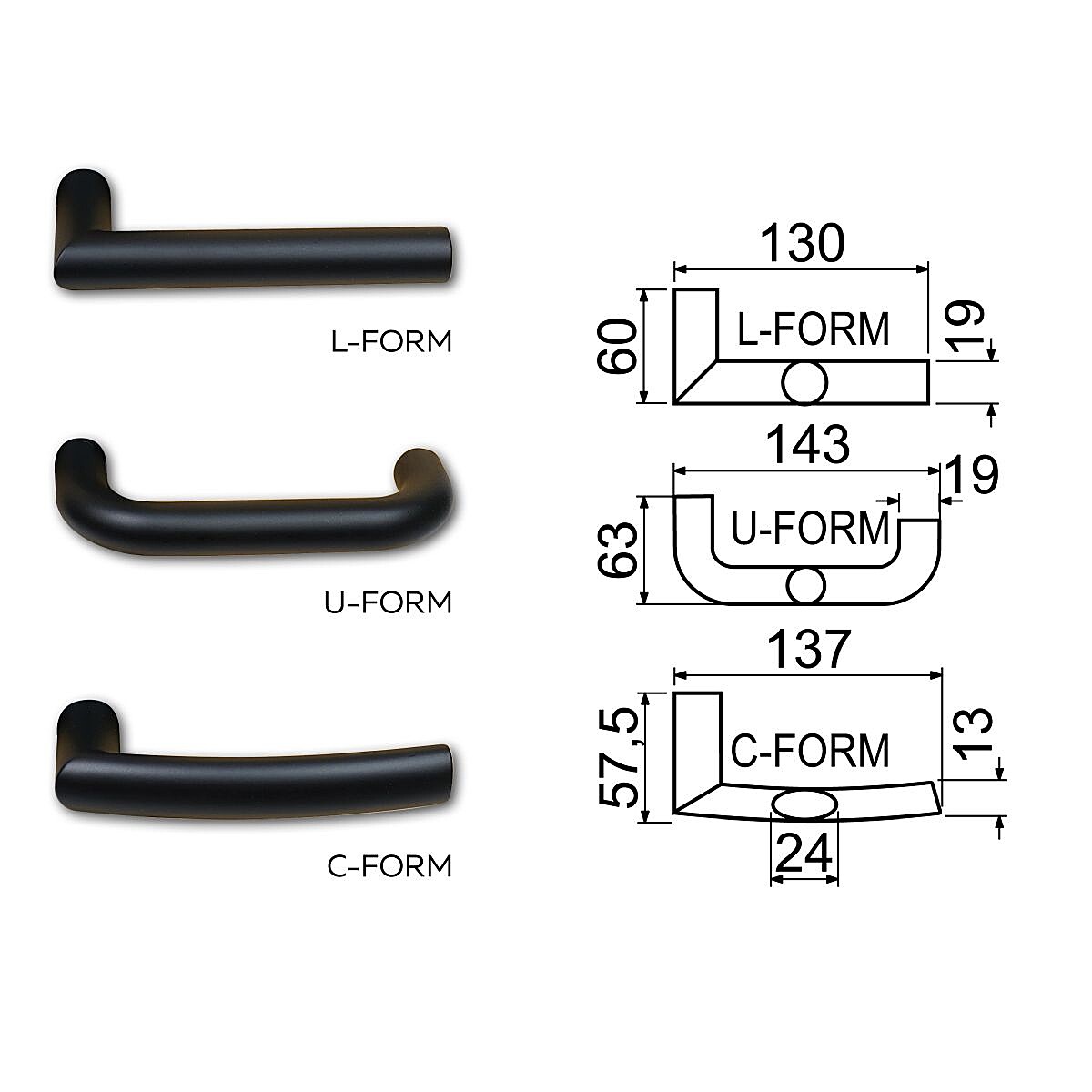 - Uchwyt standardowo dostarczany jest w kształcie "C-FORM", na życzenie może być dostarczony w kształcie "L-FORM" lub "U-FORM".