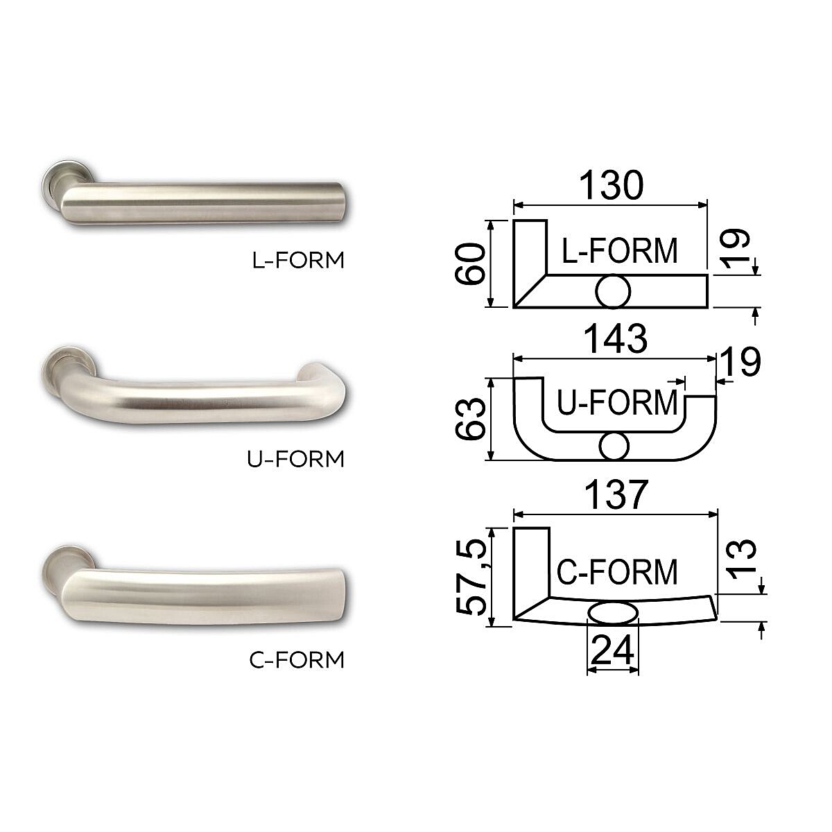 - Modułowy system osprzętu pozwala na wymianę wszystkich jego zewnętrznych elementów (tj. klamki, uchwytu, rozety, osłony tarczy).