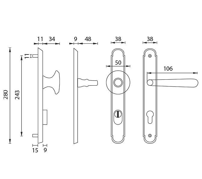 W przypadku okuć wzmocnionych należy znać odległość między osią klamki a osią klucza (skok). Standardowa odległość wynosi 72, 90 lub 92 mm. Okucia są standardowo dostępne dla drzwi o grubości od 38 mm do 50 mm.
