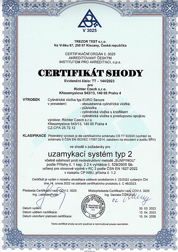 - Posiada certyfikat klasy bezpieczeństwa RC3 zgodnie z normą ČSN EN 1627:2012.