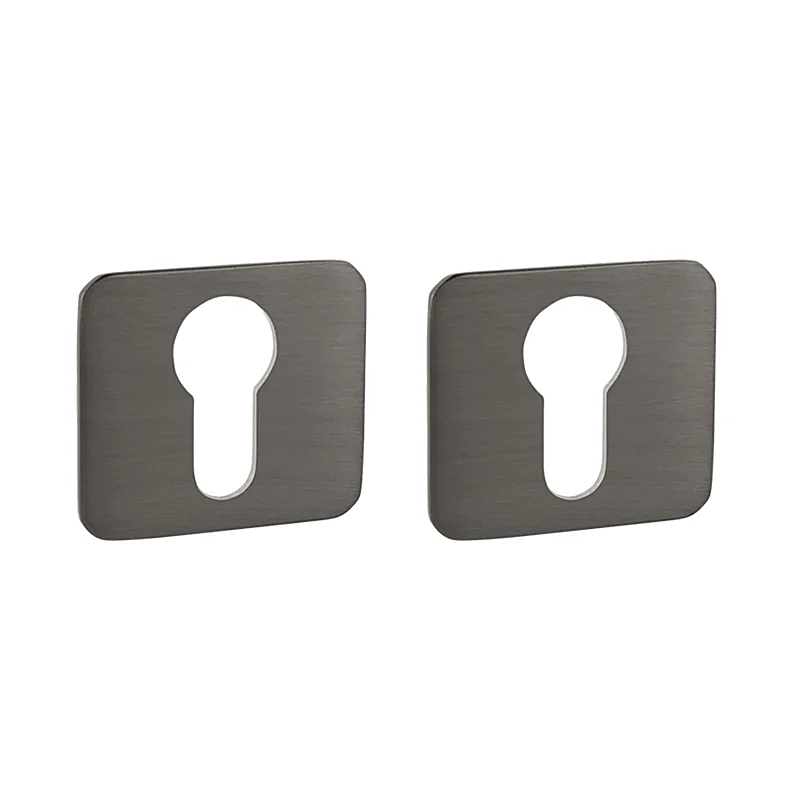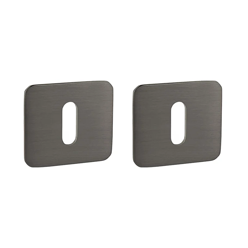 Rozeta ma wymiary 48 mm x 44 mm, grubość 2 mm i otwór owalny na klucz wewnętrzny (BB), otwór na wkładkę bębenkową (PZ) lub zestaw WC z wbudowanym kluczem.