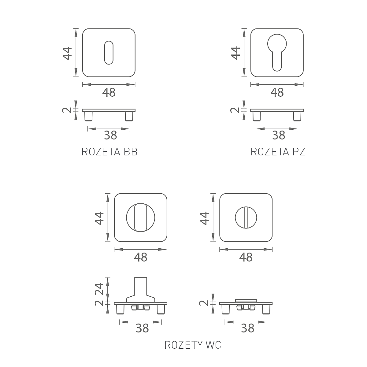 Rozeta ma wymiary 48 mm x 44 mm, grubość 2 mm i otwór owalny na klucz wewnętrzny (BB), otwór na wkładkę bębenkową (PZ) lub zestaw WC z wbudowanym kluczem.