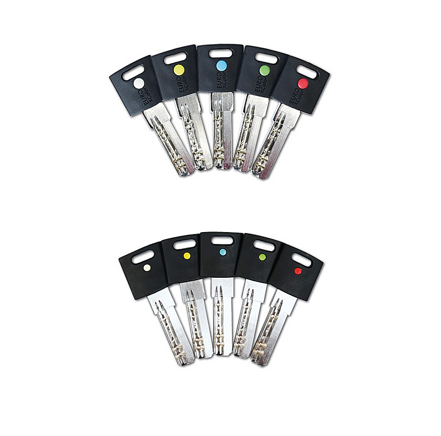 - Odpowiednie klucze każdego cylindra zawsze zawierają 5 różnych kolorów pinów: czerwony (CRV), niebieski (MOD), zielony (ZEL), żółty (ZLU), biały (BIL)