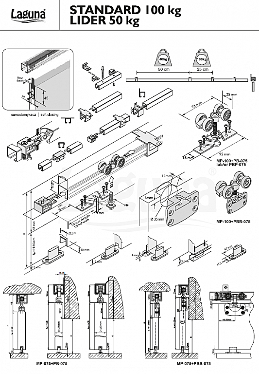 Aby zamontować jedno skrzydło drzwiowe wystarczy zakupić jeden komplet z kółkami i prowadnicą. Do montażu cięższego skrzydła można zastosować dwa komplety tj. 1 komplet = 40kg, dwa komplety = 80kg itd.