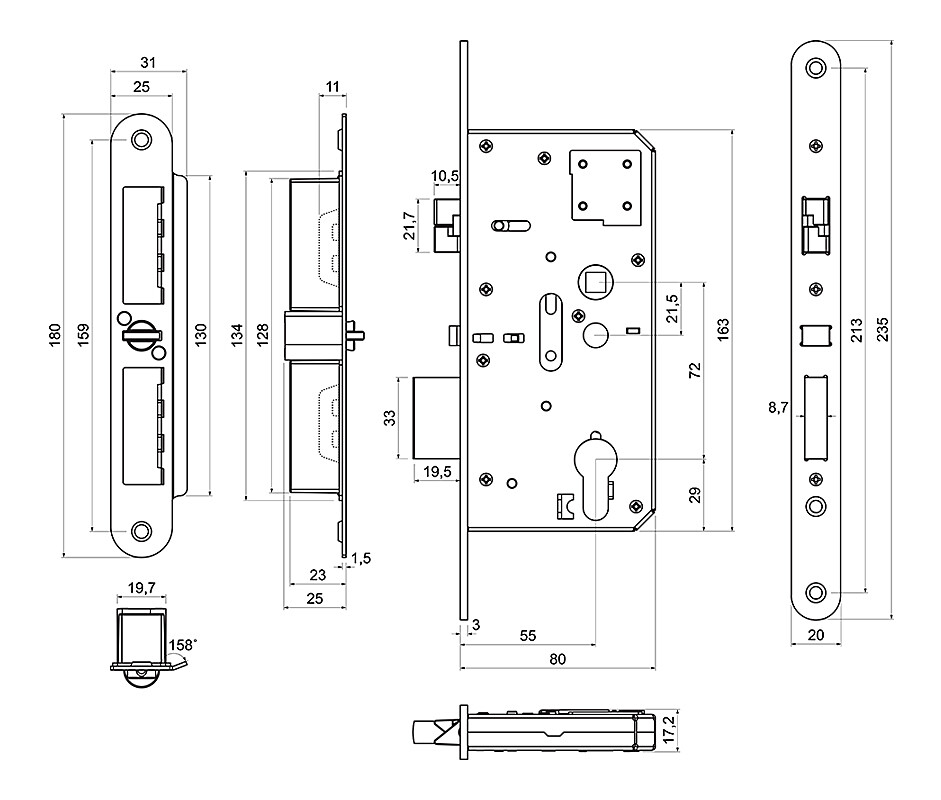 • Funkcja – rygiel zamka blokuje się automatycznie po zamknięciu drzwi – ruch ten zapewnia zatrzask pomocniczy. W stanie zablokowanym zamka blokowany jest również zatrzask główny zamka.