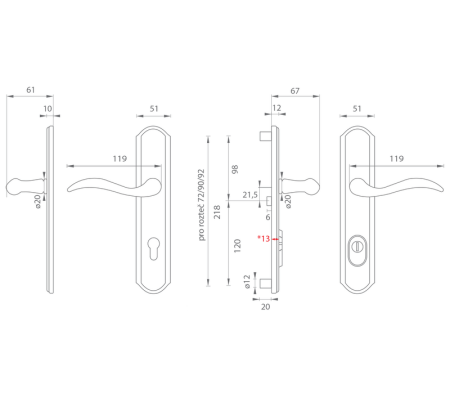 W przypadku okuć wzmocnionych konieczna jest znajomość odległości między osią klamki a osią klucza (skok). Standardowa odległość wynosi 72, 90 lub 92 mm. Okucia są standardowe dla grubości drzwi od 38 mm do 50 mm.